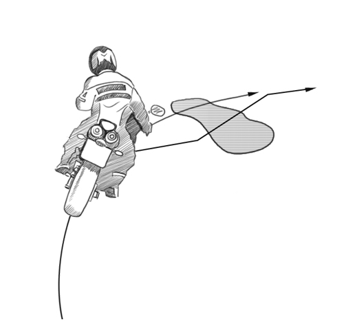 Помимо прохождения плавных поворотов мотоциклисту нужно уметь быстро перестраиваться, объезжать препятствия или корректировать свою траекторию в наклоне. Попробуйте, используя контрруление, сделать поворот, наклоняясь вместе с мотоциклом на прямых руках.