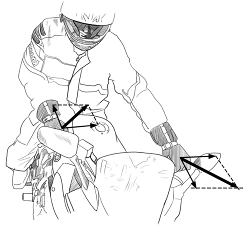 Допустим, Вам нужно быстро наклонить мотоцикл влево. Для того, чтобы мотоцикл наклонился и поехал влево вам нужно надавить от себя левую рукоятку руля и потянуть правую – применить контрруление. Сила в этом случае прикладывается приблизительно параллельно направлению движения. Если мы хотим помочь себе корпусом, как в случае медленного маневрирования,то есть оттолкнуть мотоцикл от себя, то сила, приложенная к рулю, должна быть направлена влево перпендикулярно направлению движения. Сложив вектора этих сил, мы получаем новый вектор, направленный под углом приблизительно 45% к направлению движения для левой руки и под таким же углом, но назад для правой. Помимо рук на руле, ваше тело может воздействовать на мотоцикл через сиденье. То есть на данном этапе логично помогать себе бедрами, помогая мотоциклу наклониться в нужную сторону, при этом, верхняя часть туловища, разумеется, отклонится в противоположную.