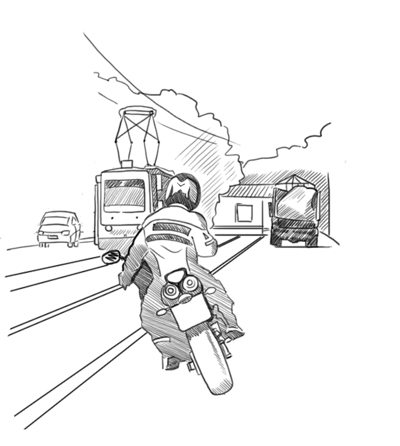 Еще одну опасность для мотоциклистов представляют продольные неровности, чаще всего это выступающие над проезжей частью трамвайные рельсы. Чем острее будет угол их пересечения, тем меньше скорость сближения колеса и рельсы, соответственно больше шансов, что одно из колес не пересечет рельсу, а поедет вдоль нее, особенно в сырую погоду, и вы упадёте. В идеале желательно пересекать рельсы под прямым углом, но не всегда дорожная ситуация позволяет это исполнить. Иногда приходится маневрировать в пределах ограниченного пространства и времени. Ваша задача увеличить скорость сближения колеса с продольной неровностью. Снова вспоминайте, как вы делали объезд препятствия. Только в данном случае вам нужно маневрировать не от препятствия, а к нему. При этом не нужно ни разгоняться, ни тормозить. Не бойтесь, что мотоцикл пересечет рельс в наклоне, главное – скорость пересечения.