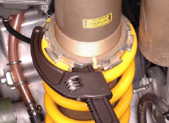 Как уже говорилось, в подвесках мотоциклов предусмотрены регулировки преднатяга пружины, гидравлики демпфирования и отбоя. Начнем с регулировки преднатяга пружины. На вилке это гайки в верхней части перьев, на амортизаторе широкая круглая пластина над пружиной, либо две гайки под Г-образный ключ.