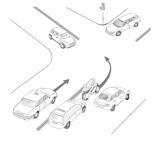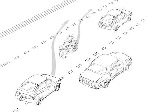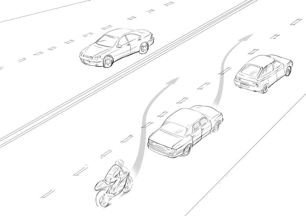 Логика такова: если в ряду не помещается другой автомобиль, то там больше никого нет. Мотоциклисту следует постоянно держать это в голове и предвидеть такое поведение автомобилистов. Если вы сомневаетесь, что вас видят, то сбавьте скорость, будьте готовы к маневру или воспользуйтесь сигналом. Ну и, конечно же, не повторяйте чужих ошибок, смотрите в зеркала перед любым маневром. Даже при повороте из крайнего левого ряда налево, убедитесь, что маневр безопасен и по встречной полосе никто вас не догоняет.
