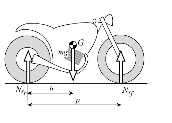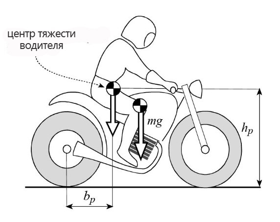 Нагружая тем самым больше заднее колесо и разгружая переднее. Для примера мотоцикл с соотношением b/p = 0,53 после посадки водителя получает это соотношение примерно 0,5.