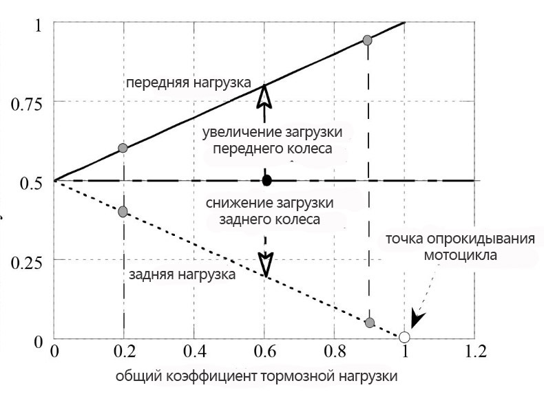 Допустим, мы имеем коэффициент тормозной нагрузки μ = 0,2 для обоих колес. Из графика видно, что значения динамических нагрузок на колеса примерно равны 0,4 на заднем и 0,6 на переднем. В этих условиях, если задний тормоз не используется, 40% максимального достижимого тормозного усилия не используется. Однако, если этот коэффициент очень высок, например μ = 0.9, нагрузка на переднее колесо составляет 0,95, в то время как нагрузка на заднее колесо составляет всего 0,05. В этом случае от заднего тормоза пользы практически нет.