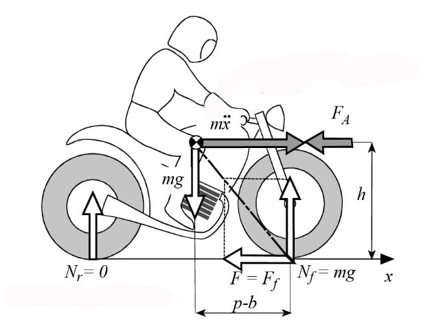 Также, судя по графику можно увидеть, что при увеличении общей тормозной силы нагрузка на заднее колесо достигает нуля. После этого заднее колесо отрывается и мотоцикл может опрокинуться вперед. В этой ситуации динамическая нагрузка на переднее колесо равна весу мотоцикла и направление результирующей динамической нагрузки и тормозной силы проходит через центр тяжести мотоцикла. Уравнение равновесия моментов относительно центра тяжести позволяет выразить тормозную силу в точке начала опрокидывания: