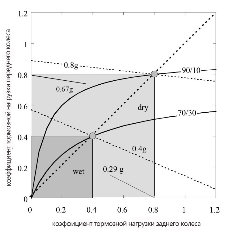 Это соотношение показывает, как распределить тормозные усилия между колесами, чтобы иметь оптимальное торможение, учитывая значение коэффициента μ