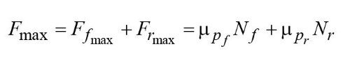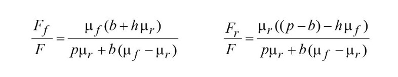 Для предотвращения срыва шины во время торможения величина тормозной силы, действующей на эту шину, не должна превышать произведение динамической нагрузки, действующей на эту шину, на коэффициент сцепления этой шины с дорожным покрытием. Это произведение представляет максимальное тормозное усилие, применимое к шине, то есть тормозное усилие на пределе скольжения. Этот параметр можно назвать коэффициентом сцепления: соответственно для переднего µpf и µpr для заднего колес: