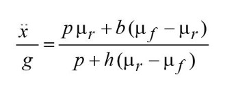 Уравнения равновесия для горизонтальных и вертикальных сил (см. выше) позволяют выразить замедление как функцию коэффициентов тормозной нагрузки для переднего и заднего колес: