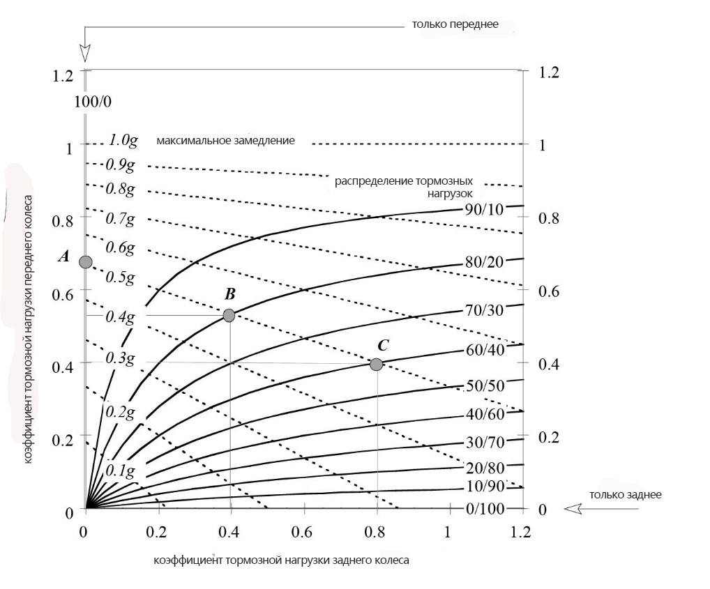 Другую возможность видим в точке С, которая показывает распределение тормозной силы 60% спереди и 40% сзади, в которой наблюдается большее использование задней шины и соответственно меньшее использование передней.
