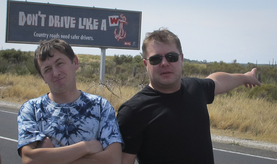 Мы пересекли границу штатов Виктория и Южная Австралия и нам стали попадаться интересные дорожные плакаты: