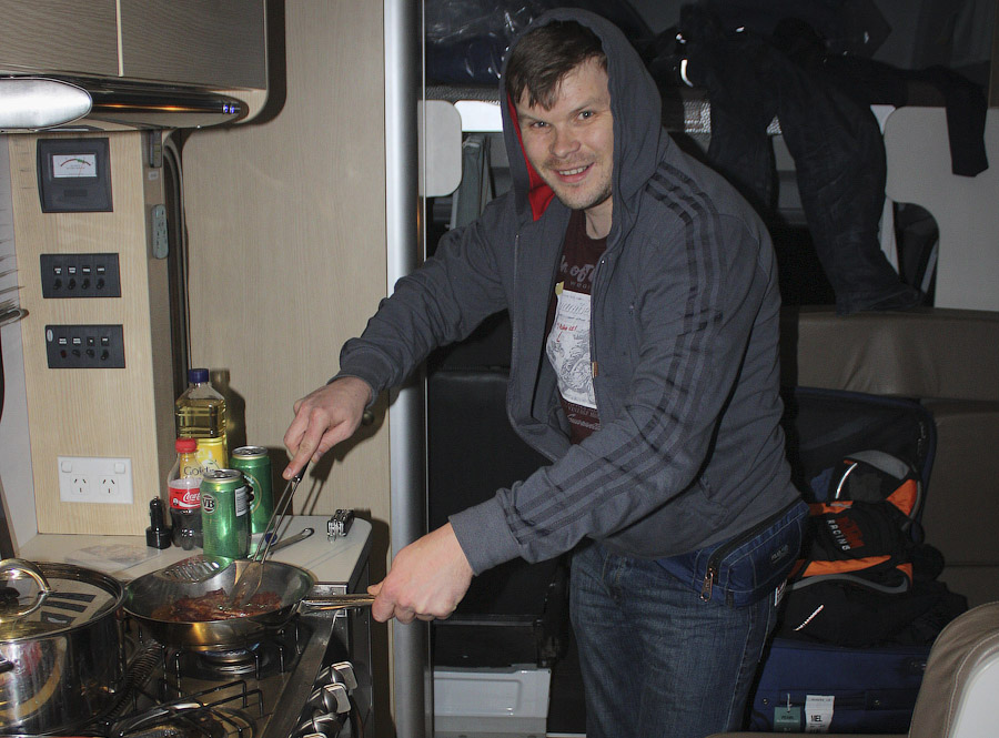 Разделение по командам оказалось очень удобно. Каждая команда самостоятельно составляла график - кто водитель (кто пьяный штурман), решала - заказывать ли мотоциклы и сколько (0 vs 1 vs 2), вела свою кассу, готовила еду (хотя ели зачастую все вместе), заправляла и убирала свой кемпер, наезжала на Студента :) …