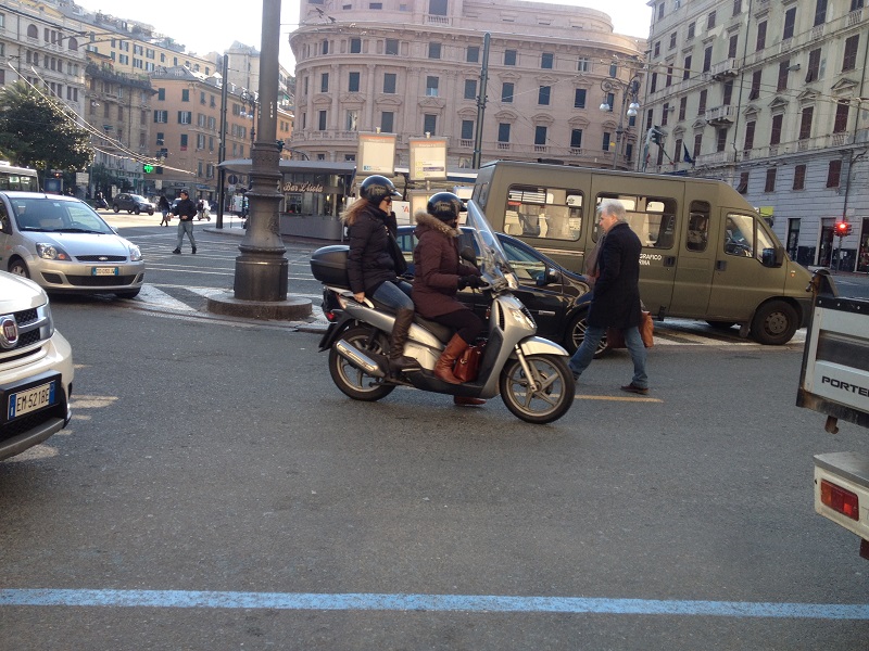 Ну и как назло именно после того, как я запечатался в дождевики, бахилы и прочее — начались типичные французские двухкопеечные гейты для оплаты дорог, каждые полчаса остановка, снимание перчаток, расстёгивание карманов, как назло карту на первом гейте не берёт, пока ковырялся и вызывал ассистента — не выключил зажигание и посадил аккум, конечно же горка, толкать сил нет, ливень и пробка, вода течёт по спине и хлюпает в рукавицах, зато согрелся :) В этот день проехал более 600 км до Генуи. Ночью кое-как нашёл отель с безопасной парковкой мотика где-то в центре, рядом с памятником Христофору Колумбу. В Генуе жизнь кипит, несмотря на холод. Парноколёсные сезон не закрывают.