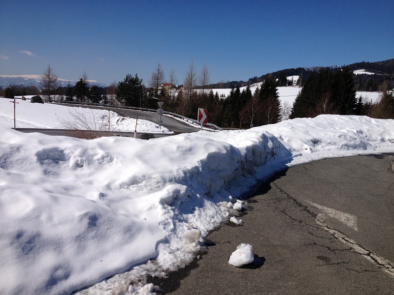 В Альпах хорошо, солнышко. Почти весна. Снег под ярким солнцем начинает таять, стекает по дороге и замерзает в теневых участках в поворотах. Мечта! Приходится к каждому повороту подкрадываться и внимательно следить за границей света и тени.