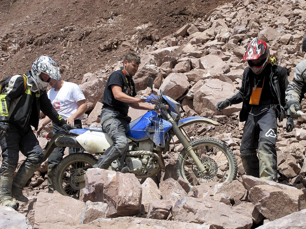 Учиться по ходу путешествия безыдейно, возьмите несколько уроков в эндуро-школе заранее. В прокате встречаются разные модели мотоциклов, нам достались Сузуки DR650 и DRZ400. То что нужно. Дорога может пролегать через перевалы и даже плоскогорья на высоте около 5000 м. Здесь идет снег и тяжело дышать.